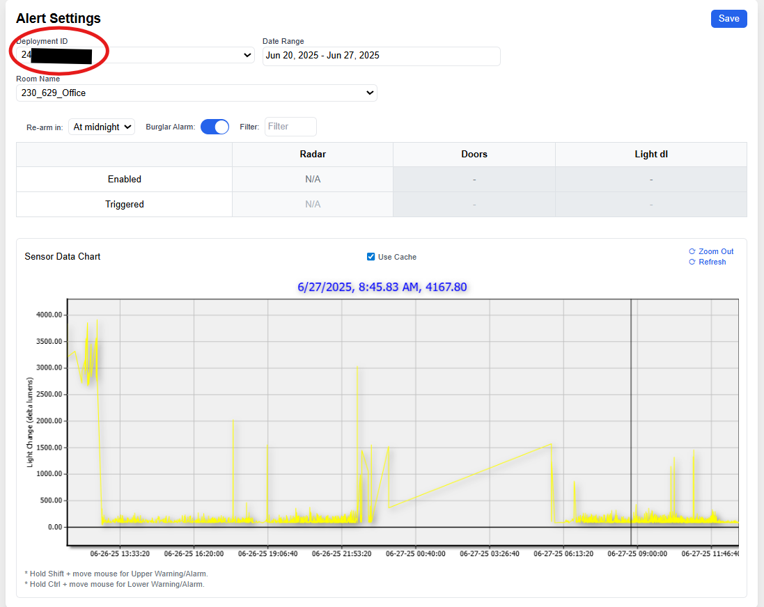- Date Range: Choose the date range for which you want to review sensor data. The data will be visualized in the form of a line graph.