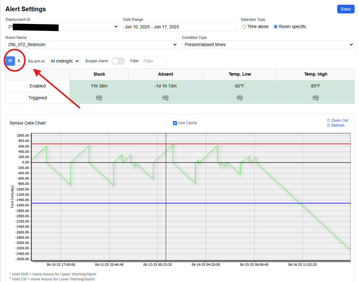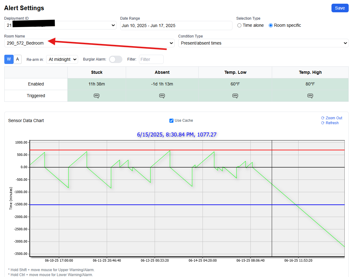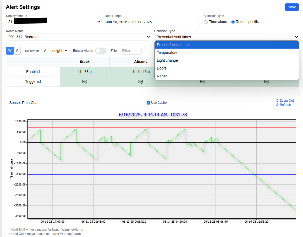 The Alert Settings section allows users to monitor deviations in beneficiary behavior by configuring alarms and warnings based on sensor data from various rooms within a deployment. Below is a detailed walkthrough of the interface components and how to manage alert configurations effectively.