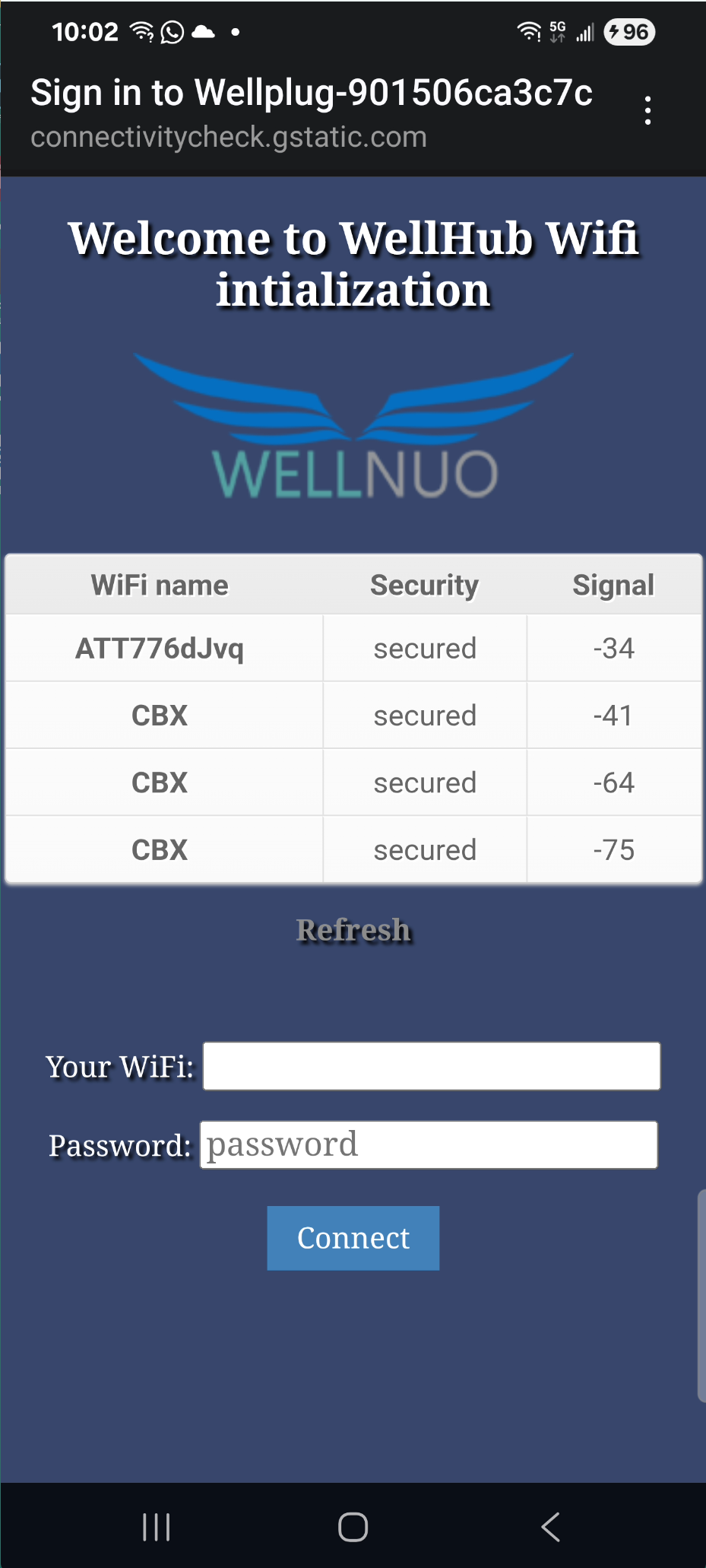 After selecting the Wellplug network, you’ll be automatically redirected to the WellHub Wi-Fi Initialization Page.