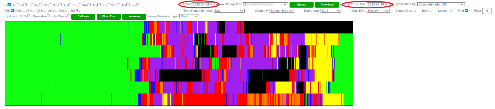 The History view allows users to visualize location-based sensor activity over an extended period (spanning multiple days). In this mode, location bars for each day within the selected date range are stacked vertically—where the topmost bars represent the most recent date.