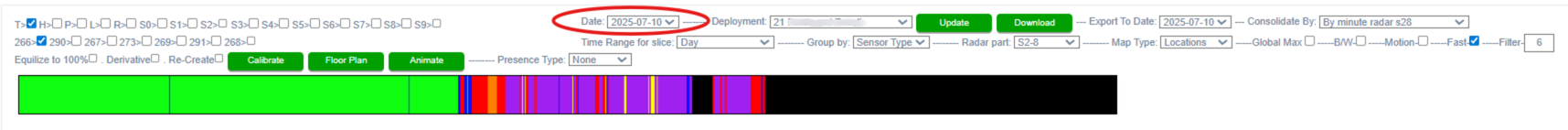 In this mode, users can visualize the location of a beneficiary at any point throughout a given day. Each color in the horizontal bar represents a different room or area, making it easy to track movement and presence over time. To determine which color maps to which room, refer to the left-hand menu in the Floor Plan section.